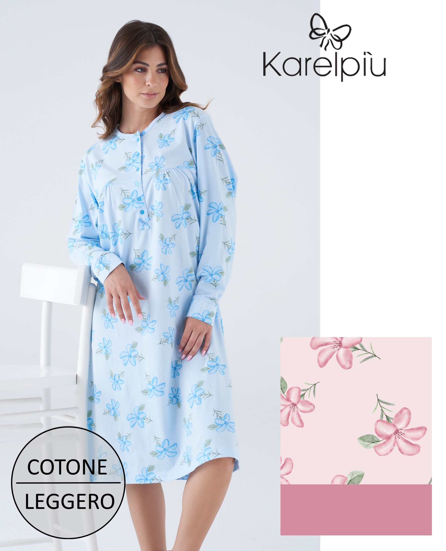 Camicia da notte donna manica lunga KARELPIU’ ART. KC8004 in PURO COTONE, fantasia e colori come foto.