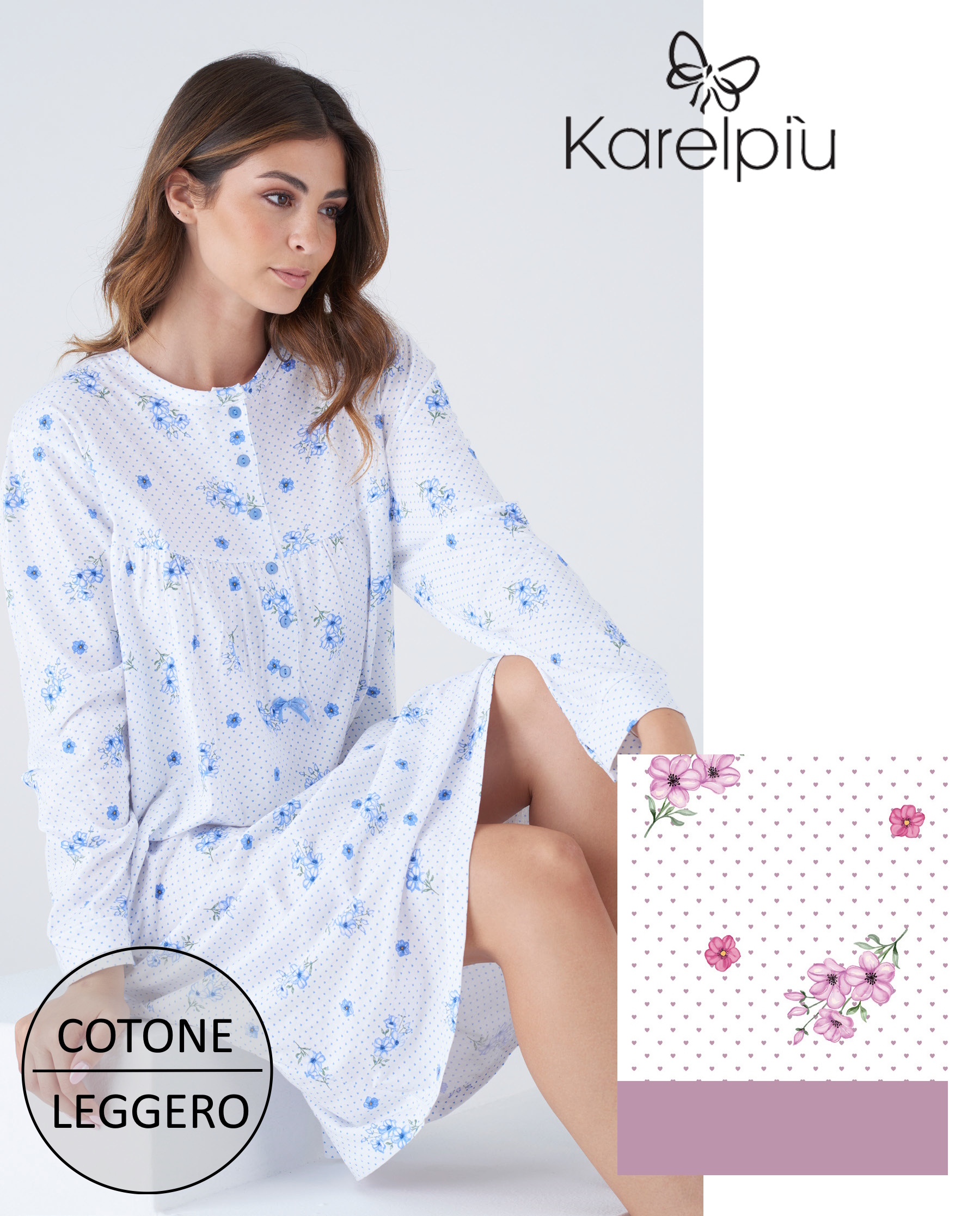Camicia da notte donna manica lunga KARELPIU’ ART. KC8016 in PURO COTONE, fantasia e colori come foto.