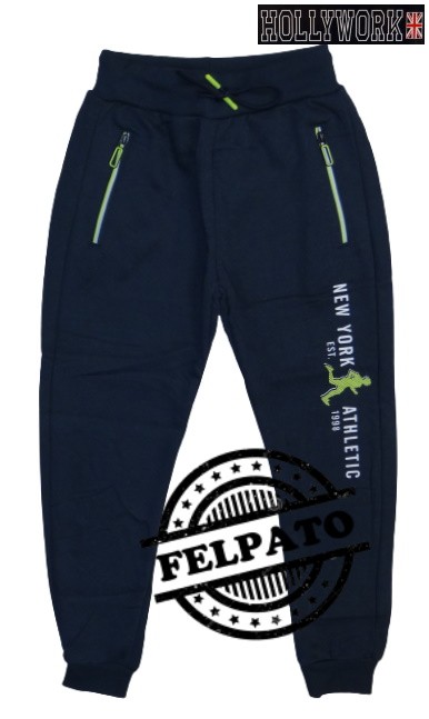 Pantaloni lunghi bimbo HOLLYWORK Art. 5715-1 in morbida e calda felpa con numero 2 tasche davanti con cerniera + coulisse, polsino in fondo, stampa sul davanti, colore come foto.