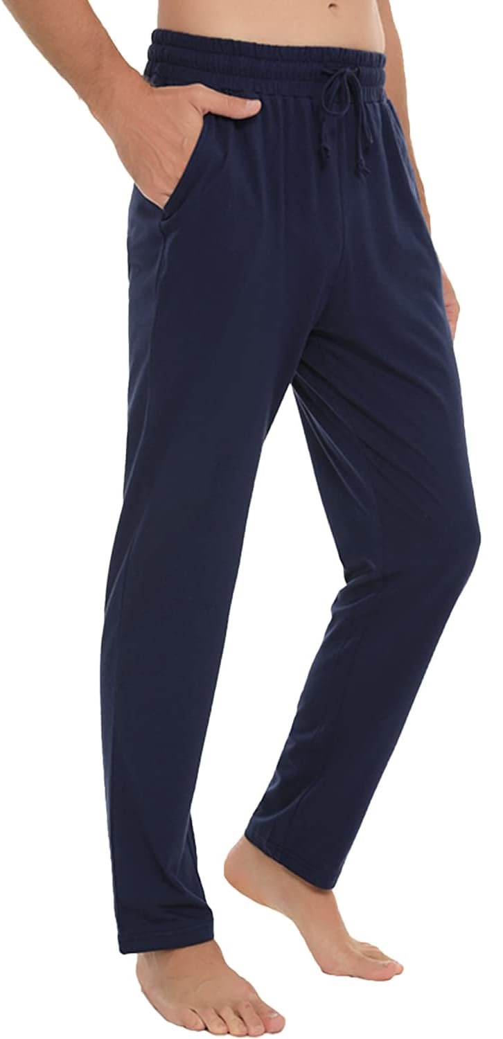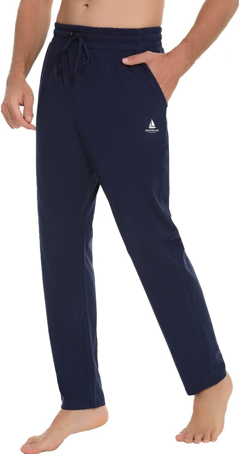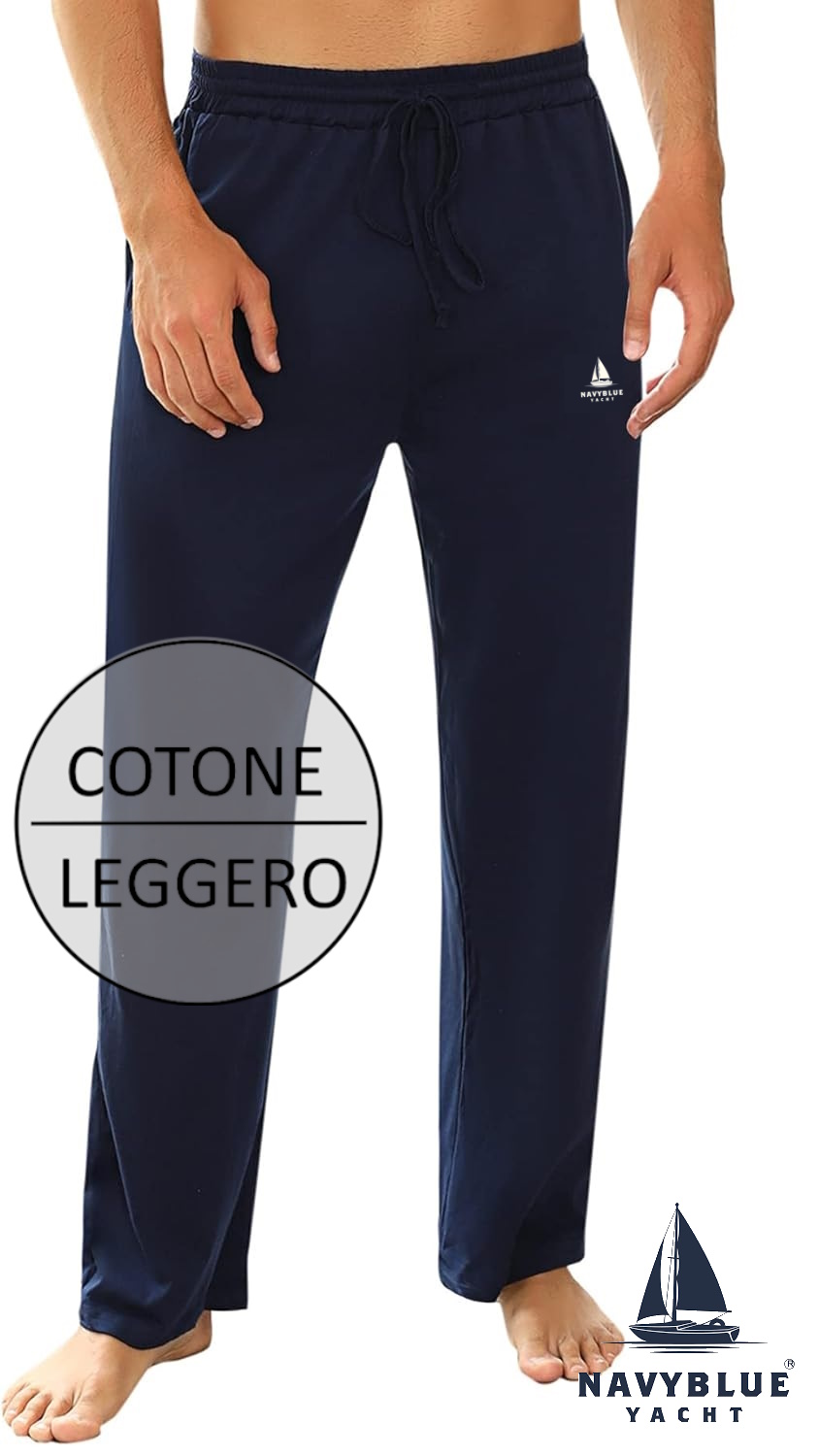 Pantalone lungo uomo NAVYBLUE Art. 2694-1 in morbido COTONE LEGGERO con 2 tasche laterali, realizzato in maglia di jersey, coulisse e piccolo logo ricamato sulla gamba di colore bianco, pantalone senza polsino in fondo.