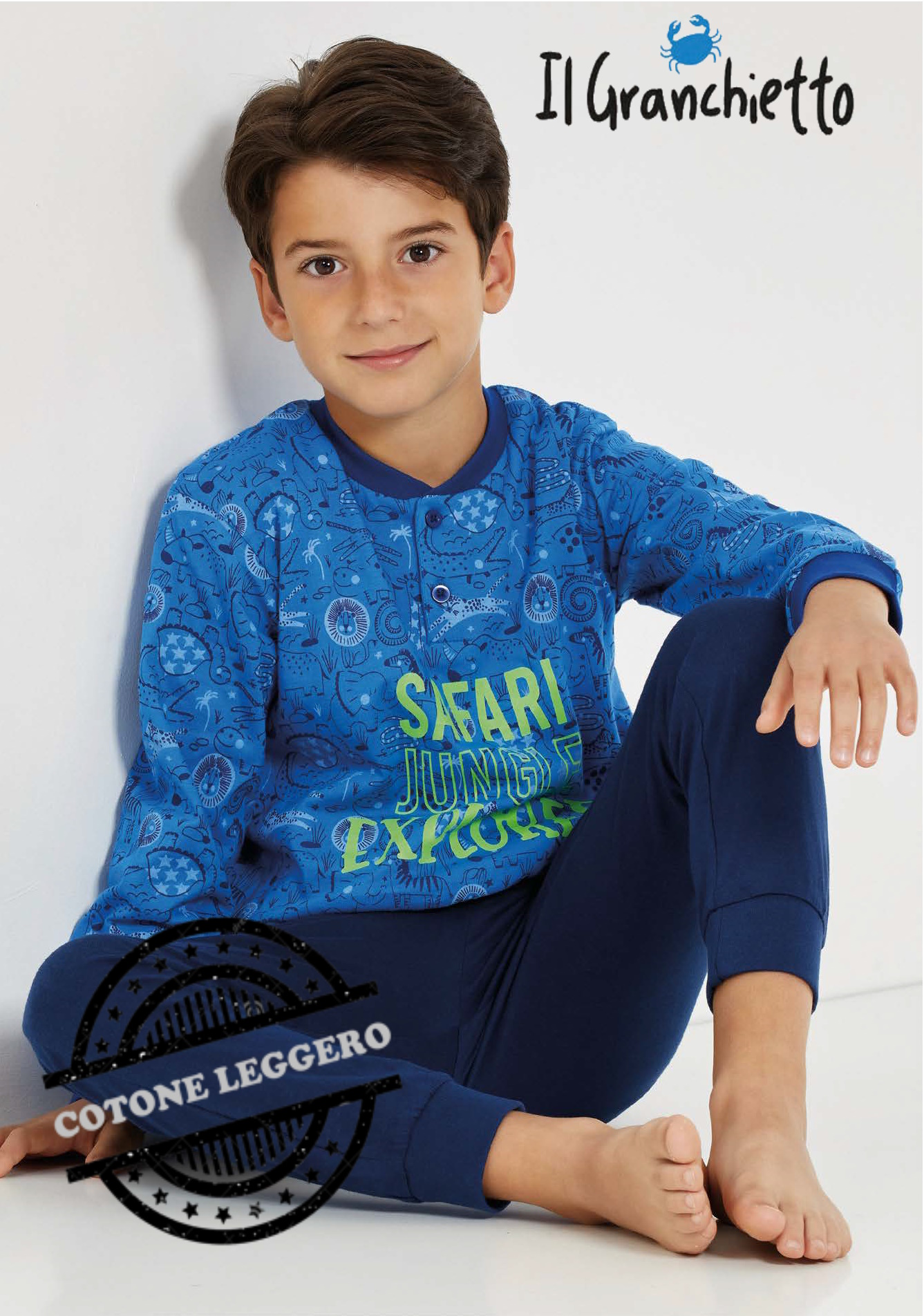Pigiama bambino manica lunga IL GRANCHIETTO Linea “IL GRANCHIO” Art. GP4055-1 in cotone leggero, pantaloncino con polsino in fondo, fantasia e colore come foto.