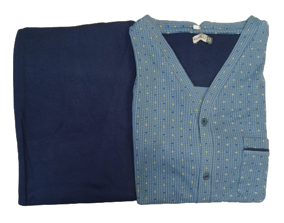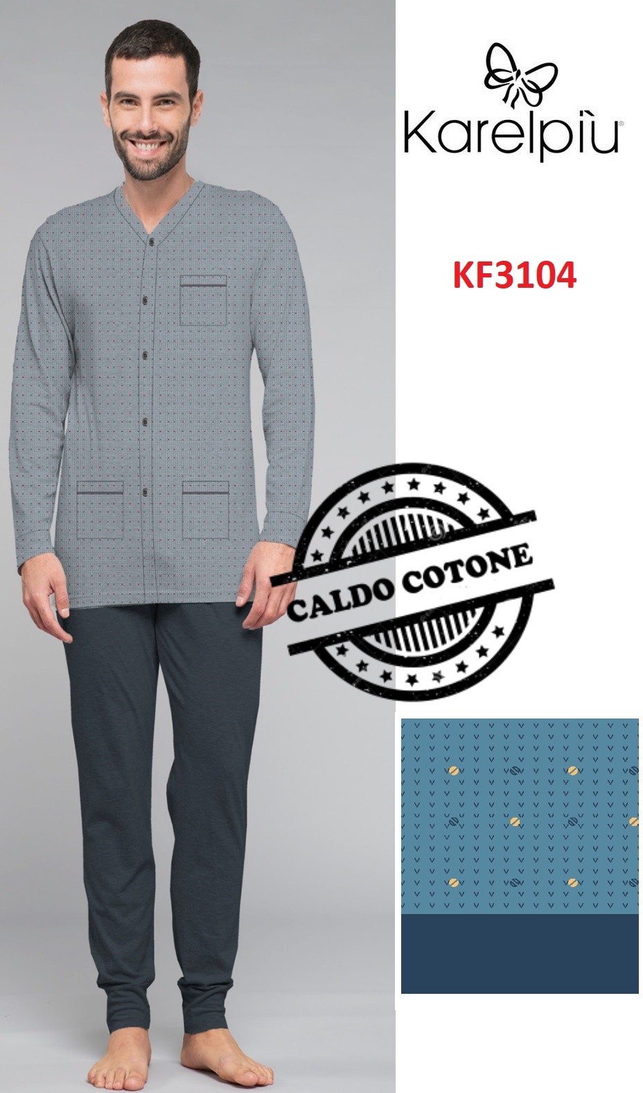 Pigiama uomo manica lunga KARELPIU’ ART. KF3104 in caldo cotone, giacca aperta davanti con bottoni, pantalone senza polsino in fondo, fantasia e colori come foto.