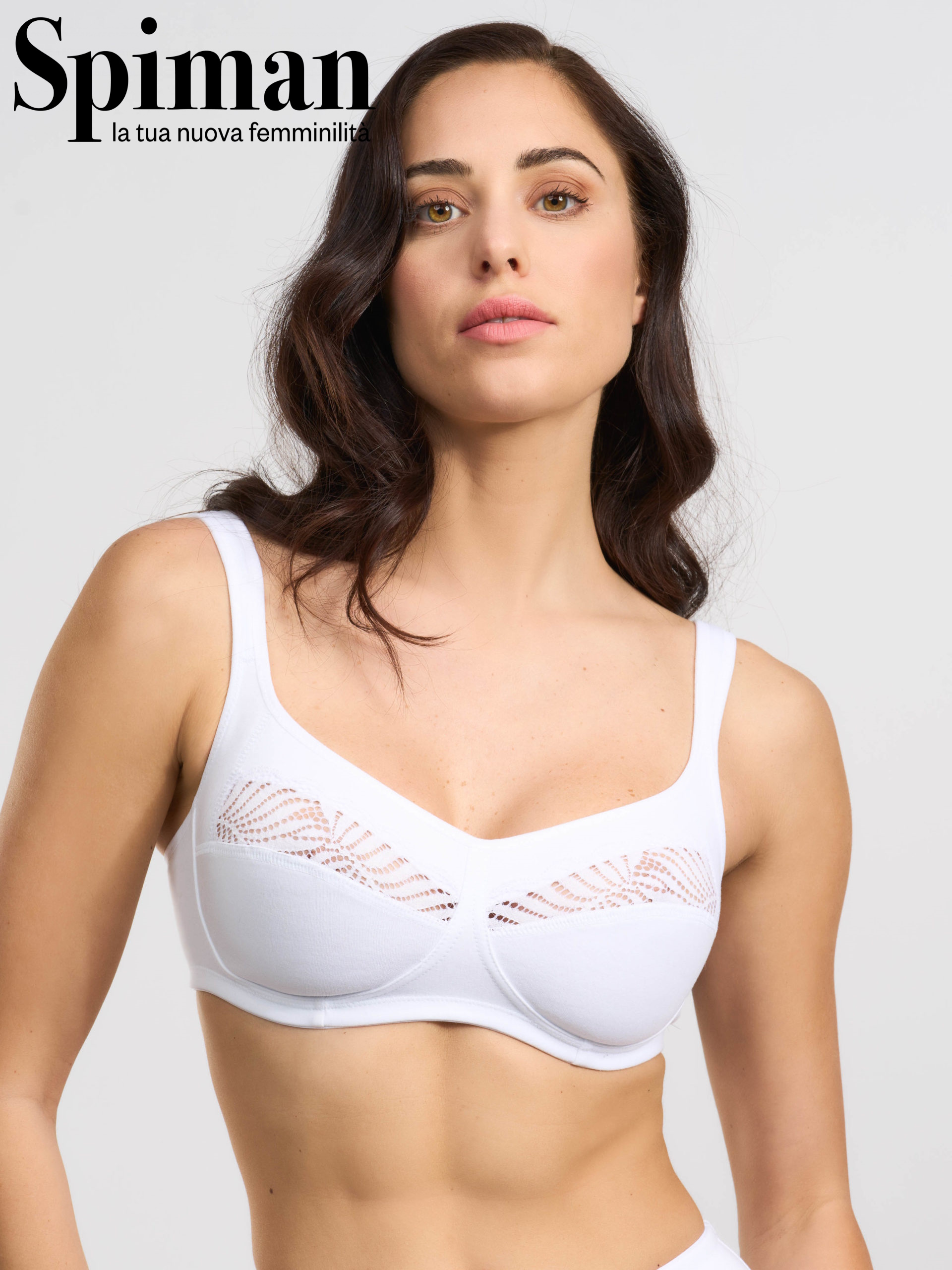 Reggiseno SPIMAN art. PAPRICA realizzato in cotone elastico, morbido e naturale, impreziosito nella coppa dall’inserto di pizzo. Coppa non imbottita con speciale struttura a tre sezioni per una vestibilità ottimale. La parte centrale alta è studiata per il comfort anche ai seni più generosi. Spalline regolabili. Chiusura a gancio a 3 regolazioni. Disponibile in coppa C